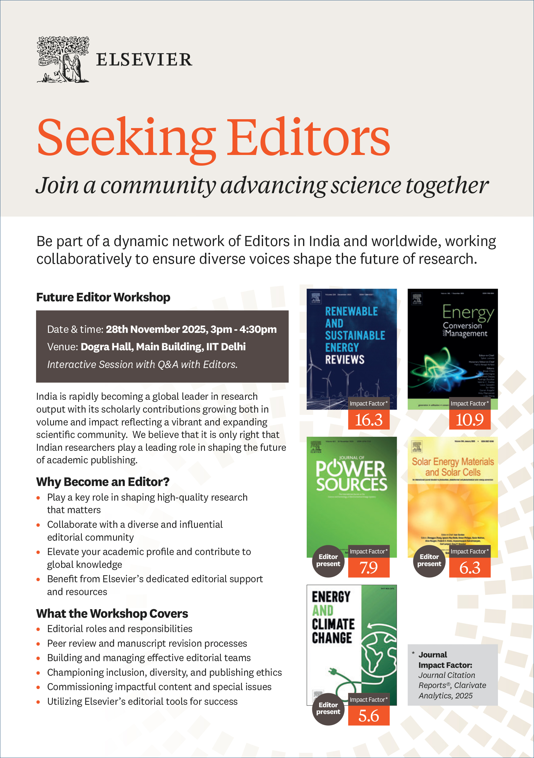 Elsevier is organising a “Future Editor" on the 28th of November, 2025, at 3 - 4:30 pm, at the Dogra Hall. This workshop is designed to help and encourage IITD faculty and senior researchers who have