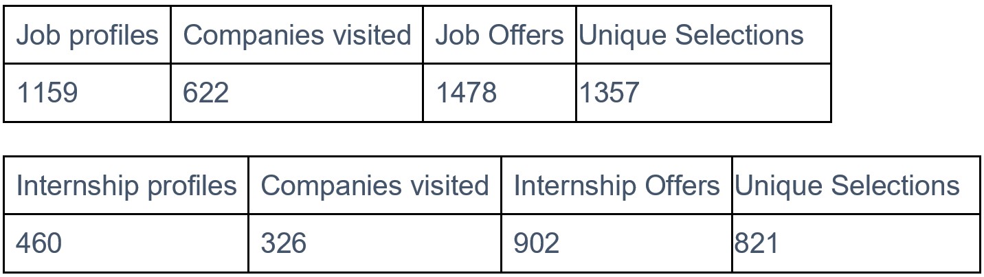 Major national and international recruiters include American Express, Barclays, BCG, BlueStone Jewellery & Lifestyle Private Limited, Deutsche India Pvt Ltd, BPCL, Google, Graviton Research Capital, Meesho, HPCL, Microsoft, Oracle, PayU, IOCL, Squarepoint Capital, Texas Instruments, C-DOT, Hero MotoCorp, Bajaj Auto, Godrej, Qualcomm, HCL Tech, Samsung, and Ambience.
