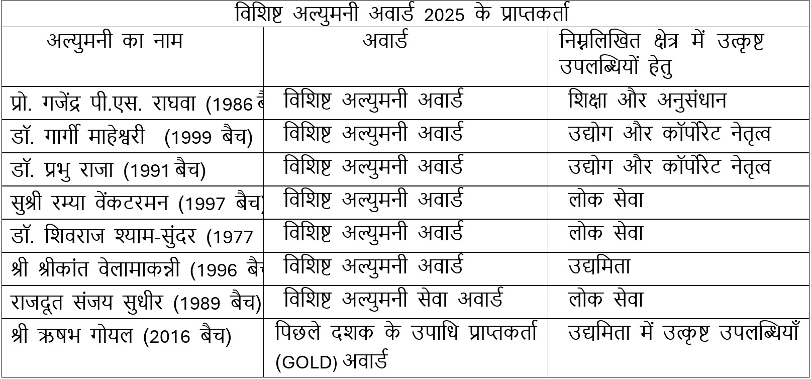 56वें दीक्षांत समारोह में, आई.आई.टी. दिल्ली ने अपने प्रतिष्ठित अल्युमनी को विशिष्ट अल्युमनी पुरस्कार 2025 [विशिष्ट अल्युमनी पुरस्कार—06, विशिष्ट अल्युमनी सेवा पुरस्कार—01, पिछले दशक के स्नातक (स्वर्ण) पुरस्कार—01] से सम्मानित किया। संस्थान ने व्याख्यान कक्ष परिसर में एक डीएए (विशिष्ट अल्युमनी पुरस्कार) वॉल का भी शुभारंभ किया।