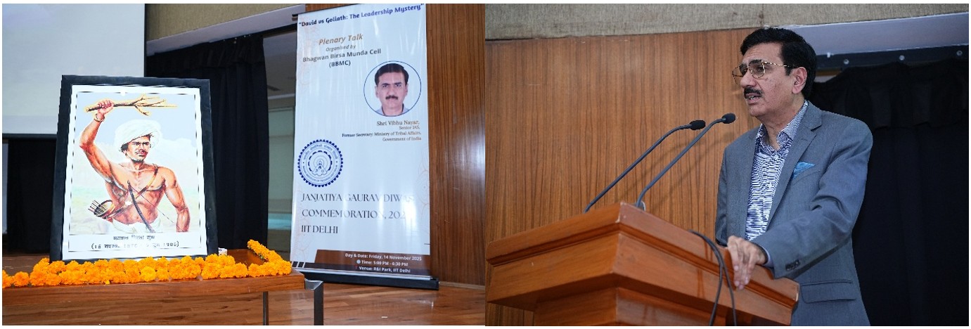 New Delhi: The Bhagwan Birsa Munda Cell (BBMC), IIT Delhi, organized a special plenary session on 14 November 2025 at the R&I Park to commemorate Janjatiya Gaurav Divas. The event featured an inspiring address by Shri Vibhu Nayar, Senior IAS Officer and Former Secretary, Ministry of Tribal Affairs, Government of India, on the theme “Leadership: David vs Goliath – The Leadership Mystery.”