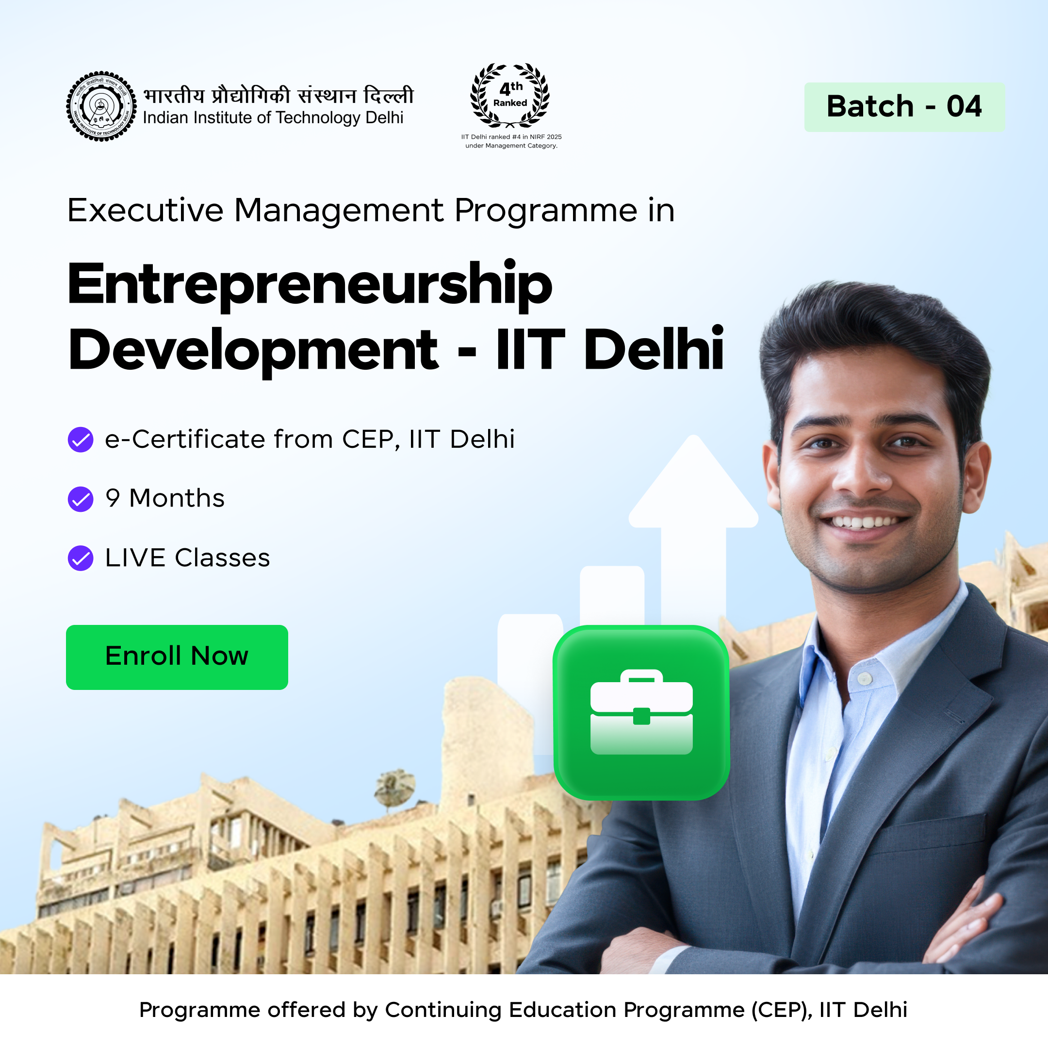 Unlock your entrepreneurial potential with a comprehensive online programme designed to equip aspiring entrepreneurs with the skills to build and grow successful ventures, offered through CEP, IIT Delhi.