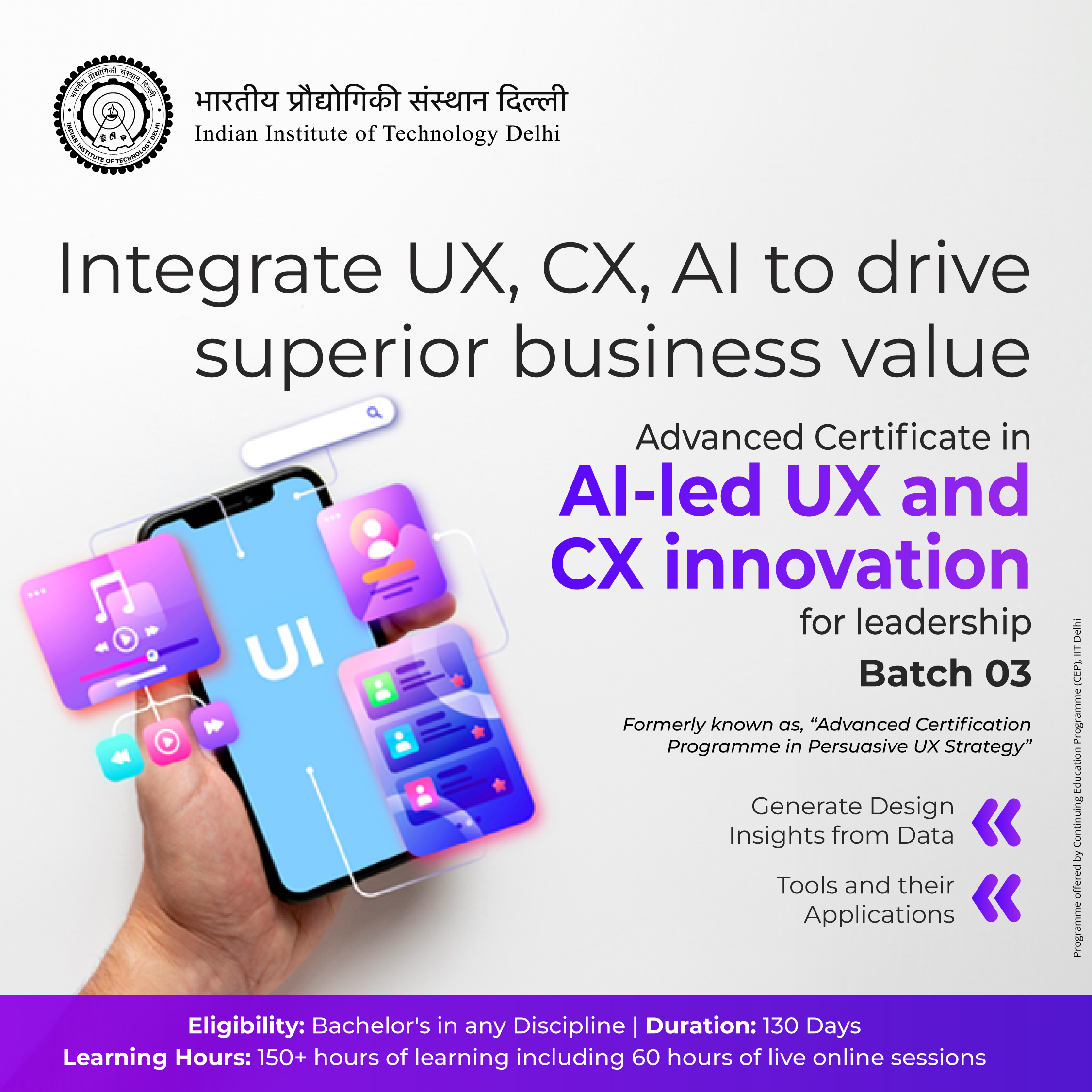 Online CEP certificate programme in "Advanced Certificate in AI-led UX and CX innovation for leadership (Formerly known as, “Advanced Certification Programme in Persuasive UX Strategy”) Batch 3"