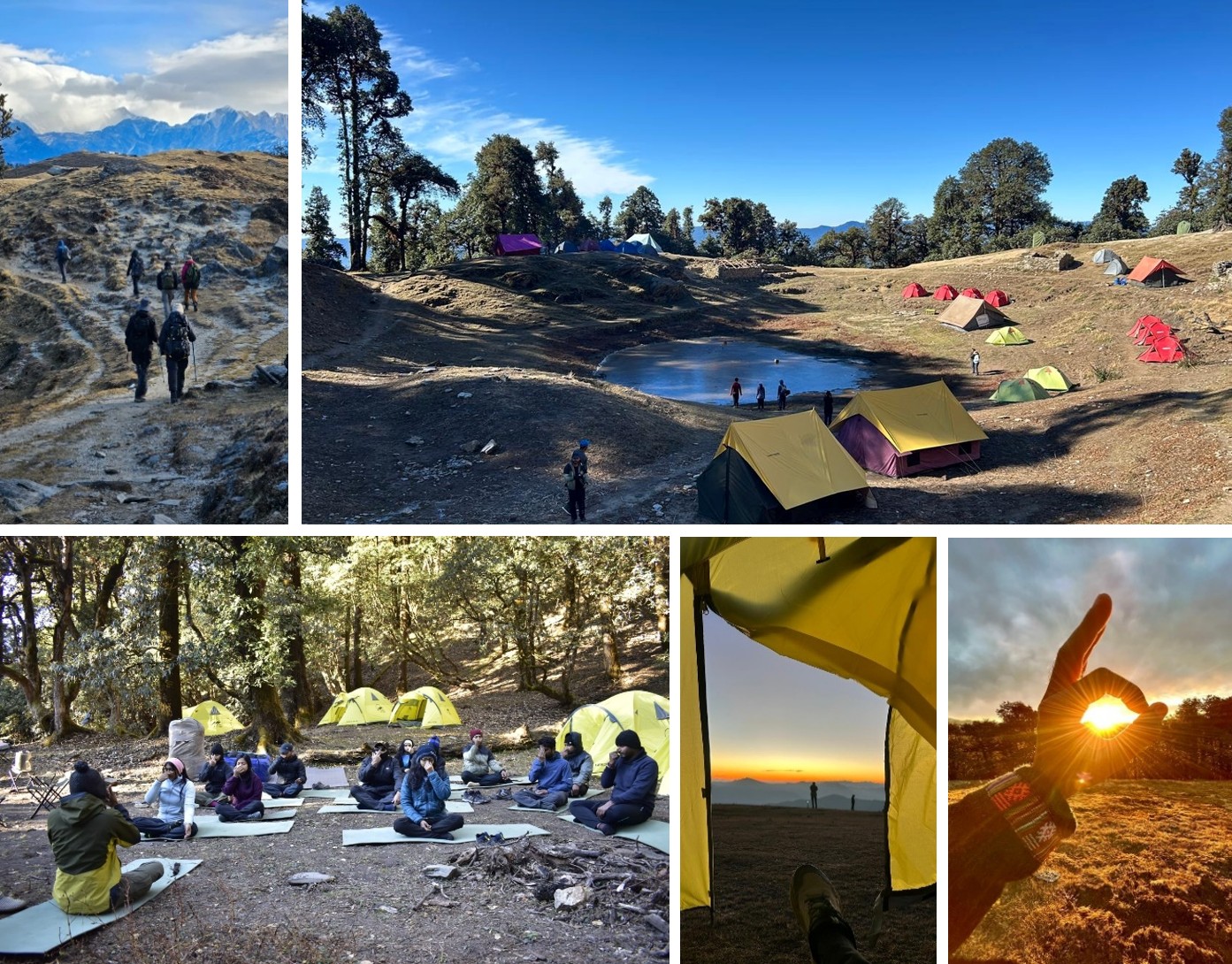 The trek to Brahmatal was shorter and began with a scenic drive past Devprayag (the iconic confluence of the Bhagirathi and Alaknanda rivers), to Lohajung- the base camp for the trek. Trekking days unfolded through oak, rhododendron, and conifer forests, with camps at Gujreni/Lower Bekaltal and Brahmatal. While the trails remained largely snow-free, the surrounding snow-clad Himalayan peaks provided dramatic and uninterrupted views. The ascent to Brahmatal Top was the visual highlight of the trek, with panoramic views of Mt. Trishul, Mt. Nanda Ghunti, Mt. Chaukhamba, Mt. Neelkanth, and Mt. Kamet.