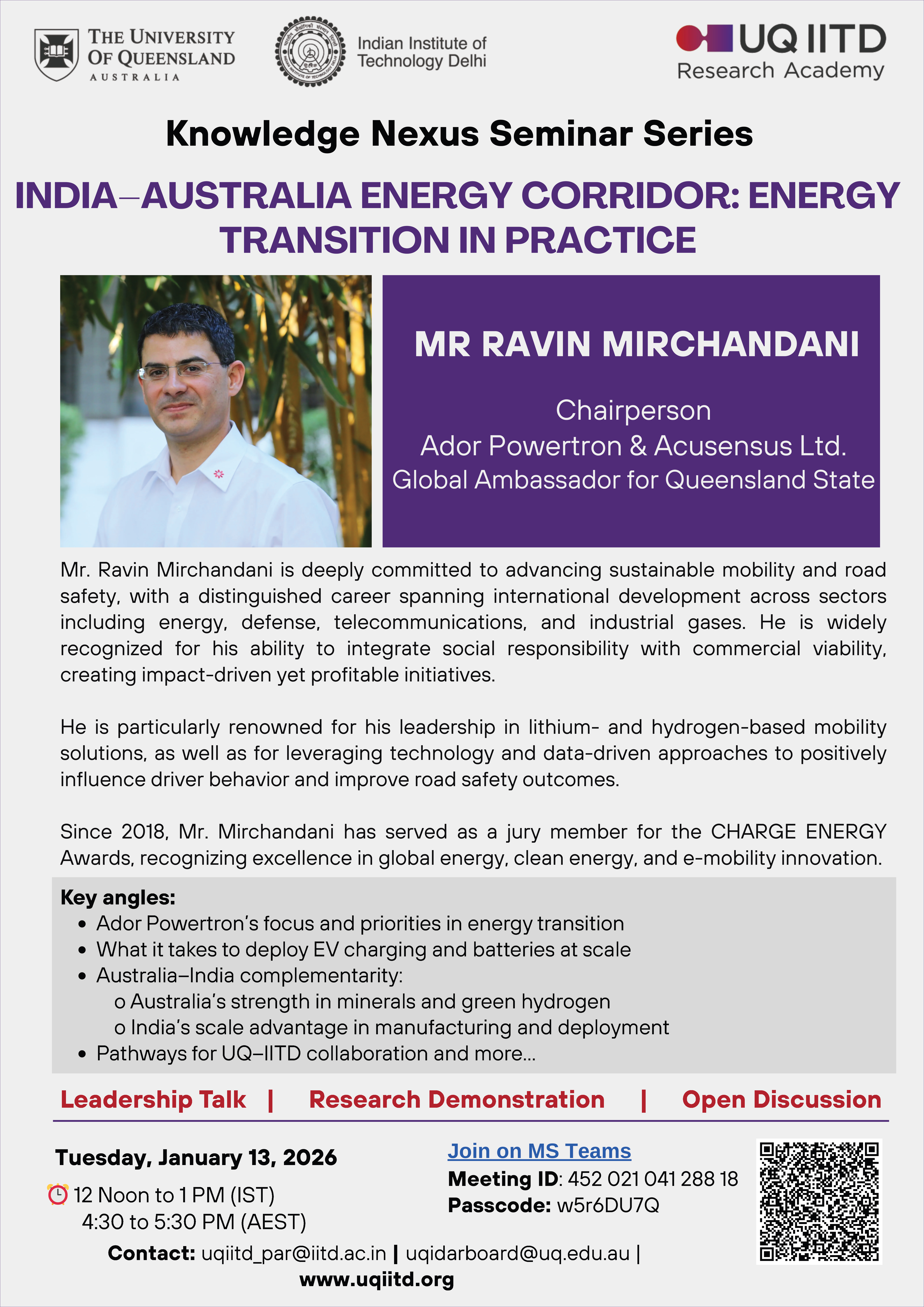 We are pleased to invite you to the UQ–IITD Knowledge Nexus Seminar, featuring a leadership talk by Mr. Ravin Mirchandani, Chairperson, Ador Powertron & Acusensus Ltd., and Global Ambassador for the State of Queensland, Australia.