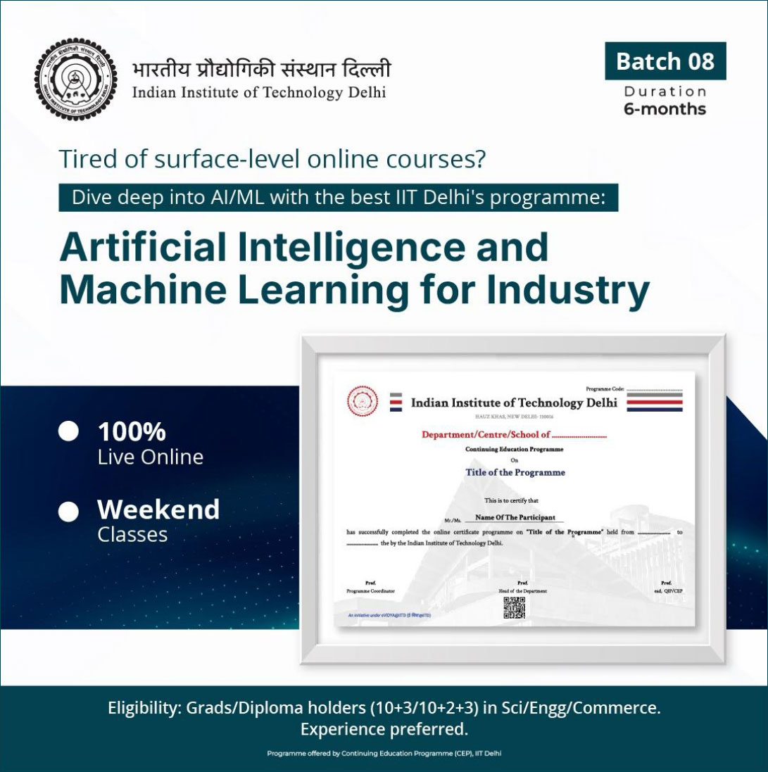 Online CEP certificate programme in "Artificial Intelligence and Machine Learning for Industry (Batch 8)"